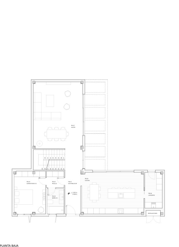 Rez-de-chaussée : Accès par un élégant couloir, salon-salle à manger à aire ouverte, cuisine moderne avec îlot, salle de lavage, une grande chambre et une salle de bain complète. Des escaliers intérieurs mènent à l’étage supérieur.