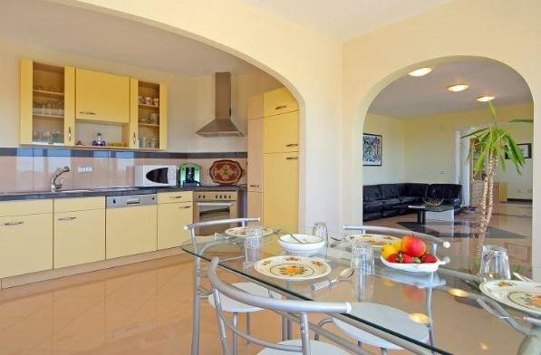 La amplia cocina de concepto abierto con comedor está totalmente equipada con vitrocerámica y lavavajillas.